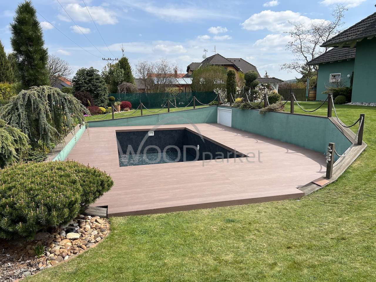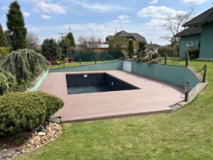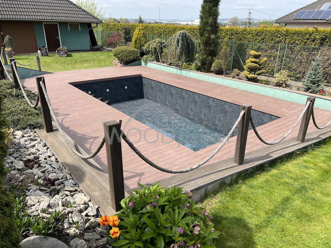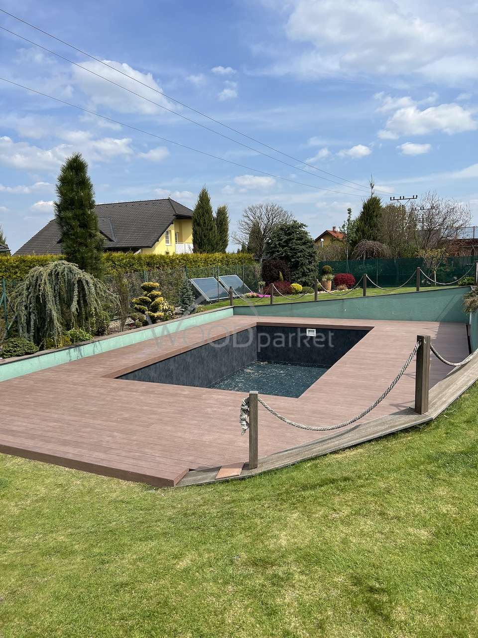 Realizace terasy u bazénu – výměna dlažby za dřevoplastovou terasu Forest Plus Palisander