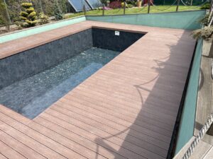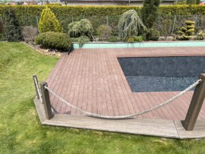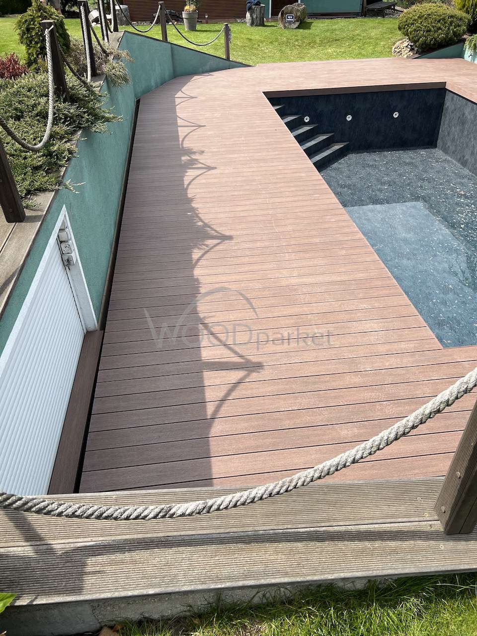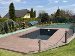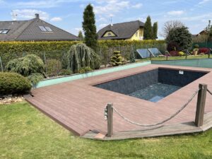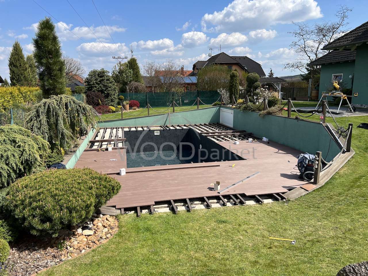 Realizace terasy u bazénu – výměna dlažby za dřevoplastovou terasu Forest Plus Palisander