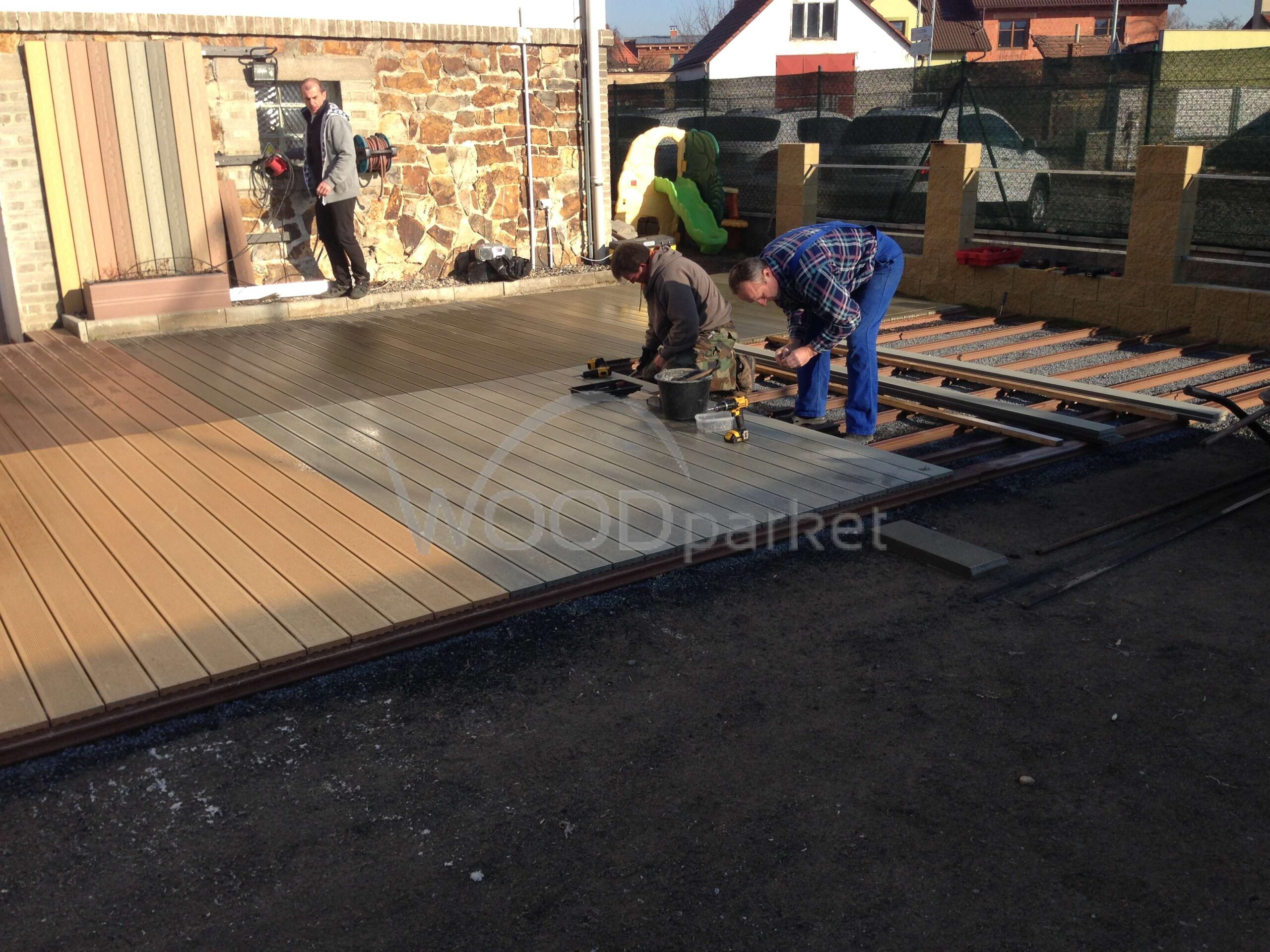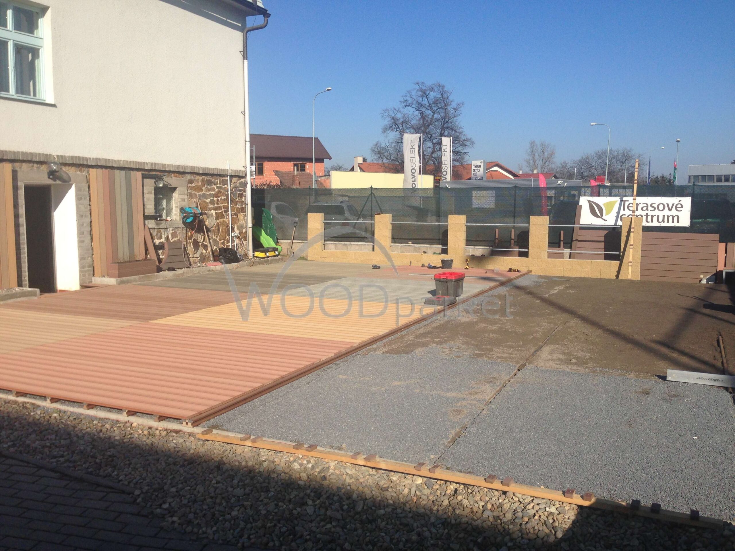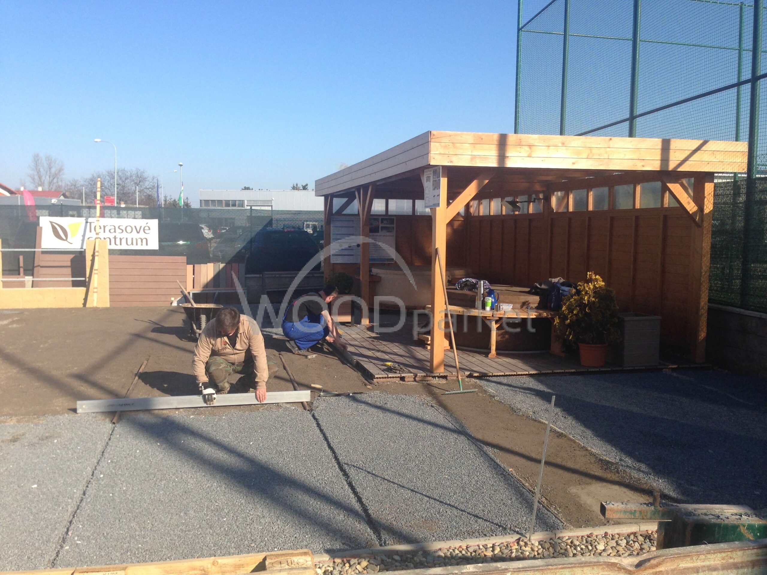 Dnes nám opět počasí přeje a tak můžeme dále pokračovat v pokládce dalších teras. Veškeré terasy si tak budete moci prohlédnout v ploše přes 200 m2 ve venkovních prostorách terasového centra v