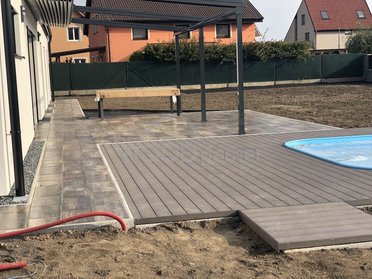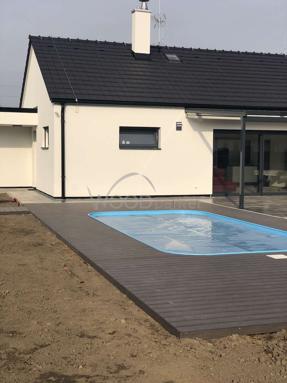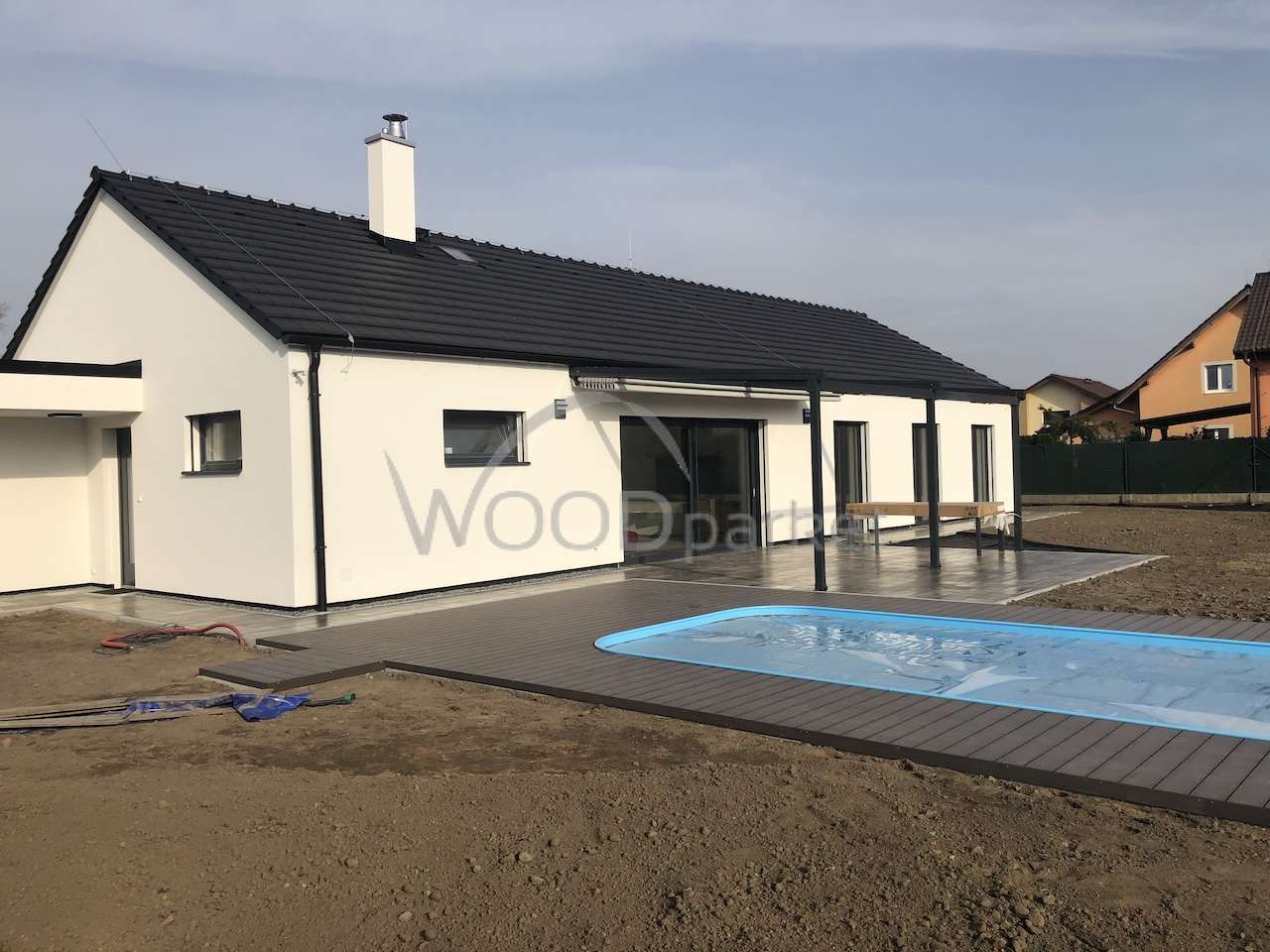 Materiál: WPC prkna Forest Eben (tmavý, strukturovaný povrch).