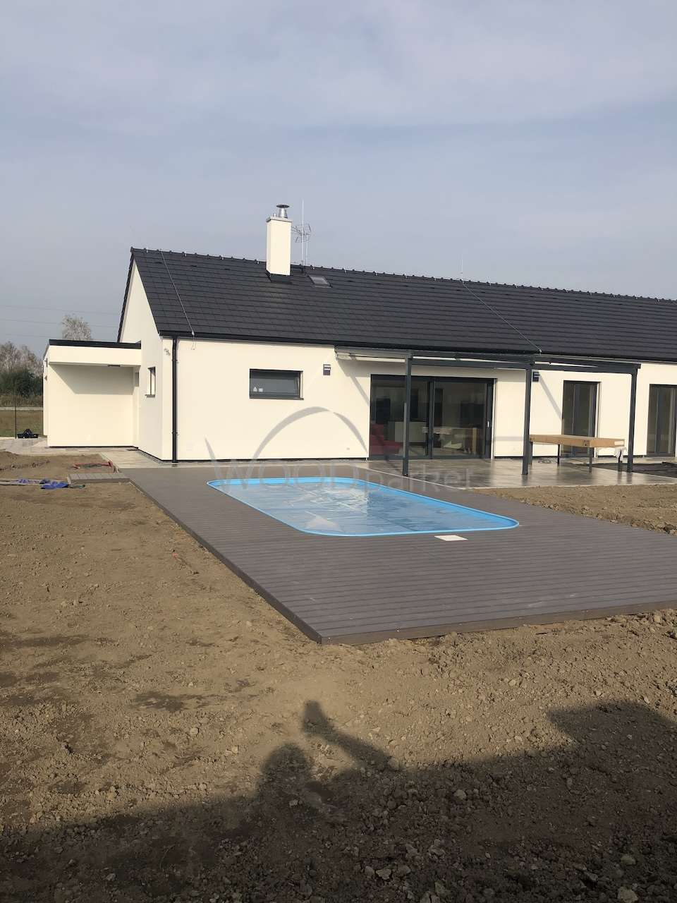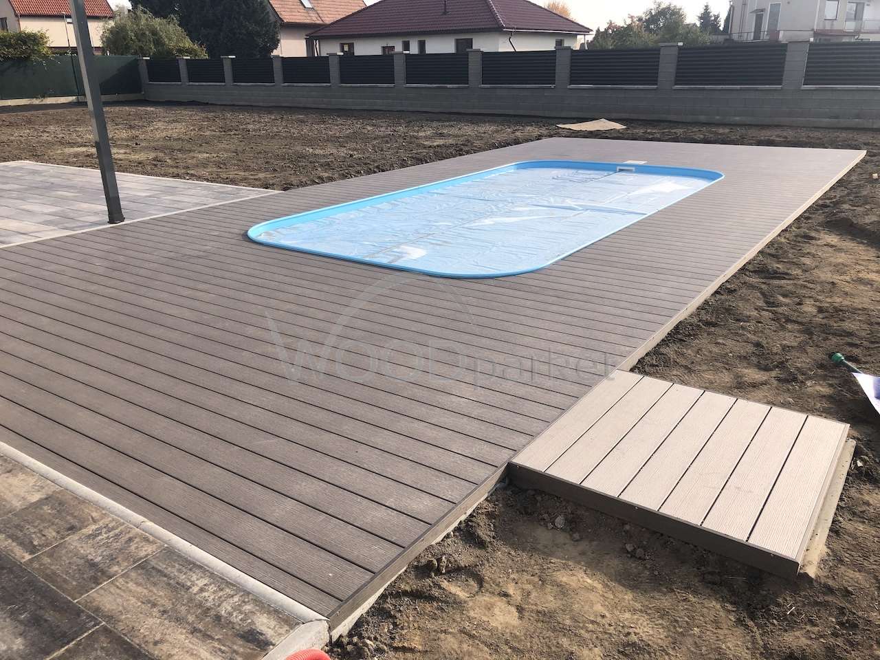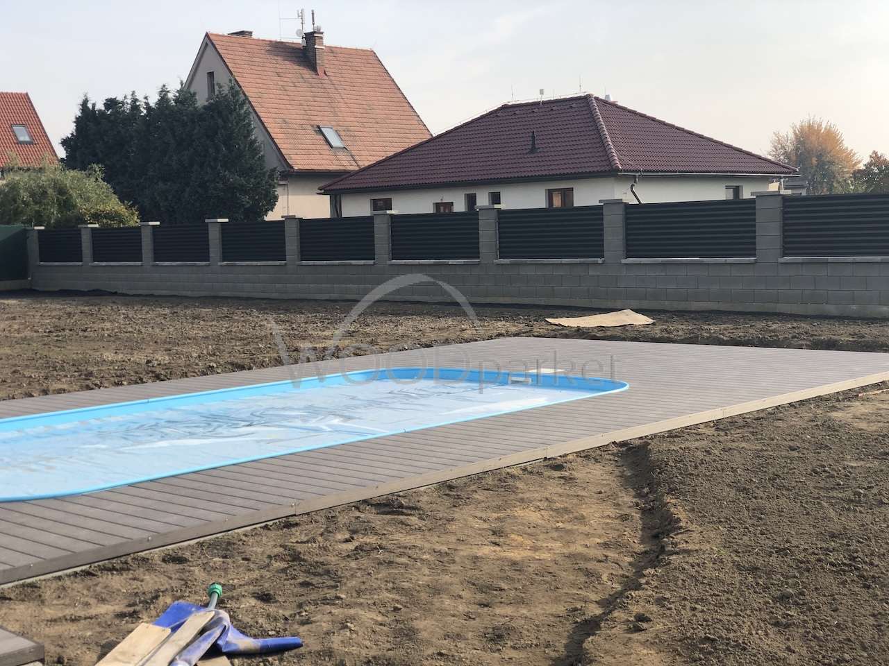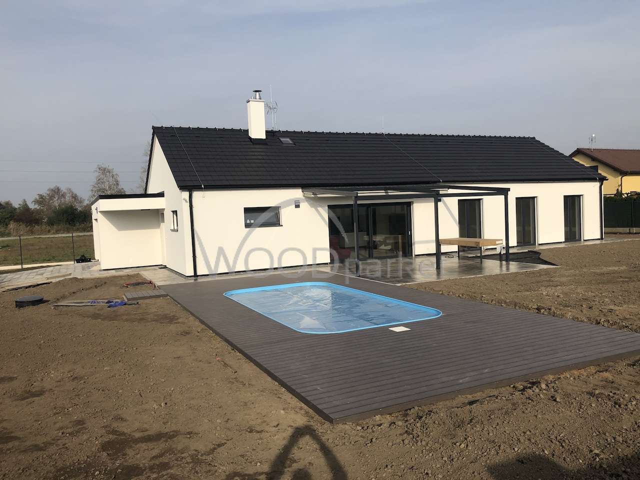 Materiál: WPC prkna Forest Eben (tmavý, strukturovaný povrch).