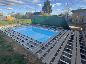 Betonový podklad: Kolem bazénu vždy doporučujeme betonový základ. Je to jediná cesta, jak zajistit absolutní stabilitu a rovinu po desítky let.