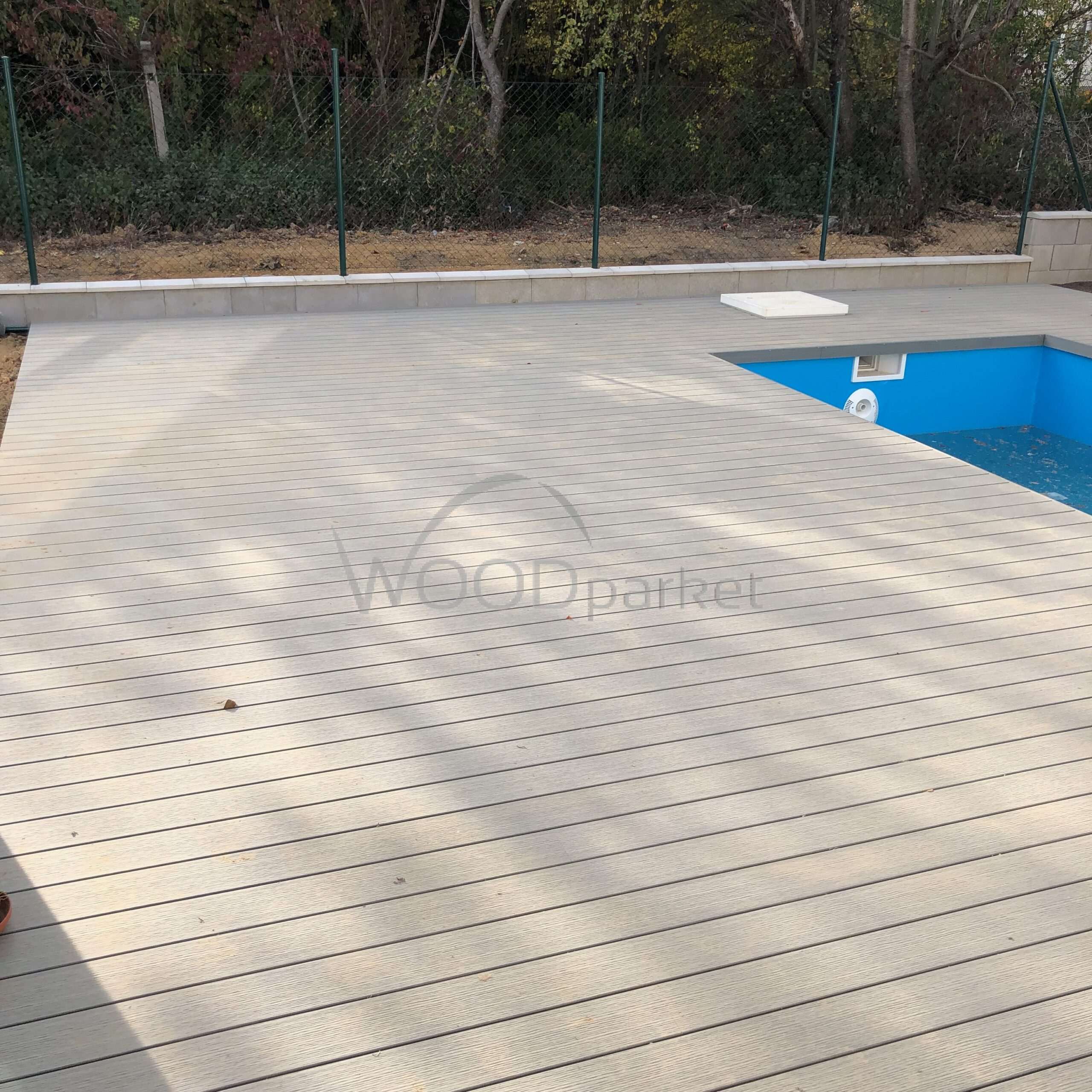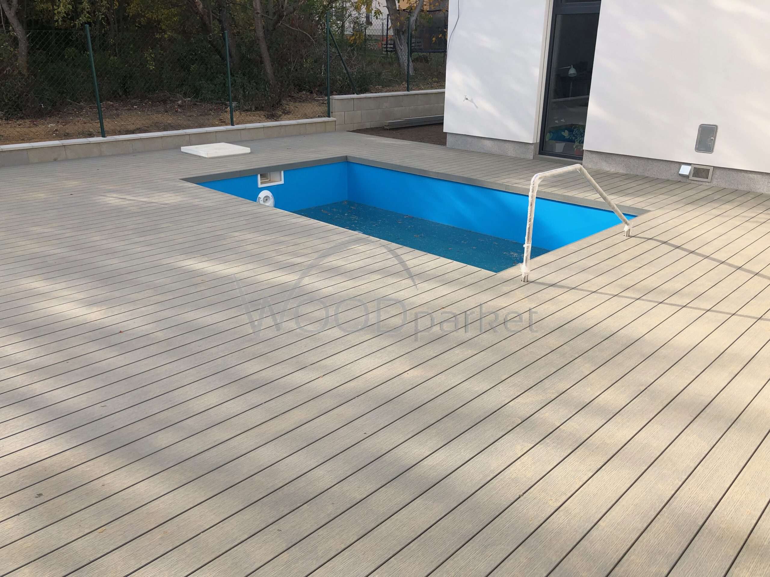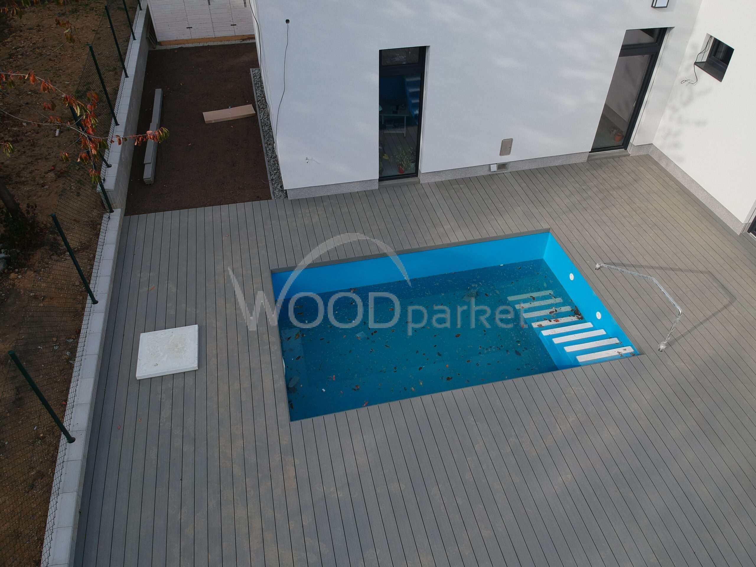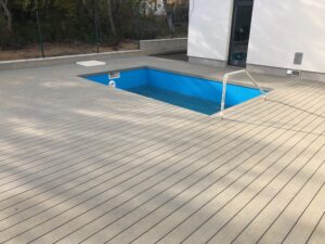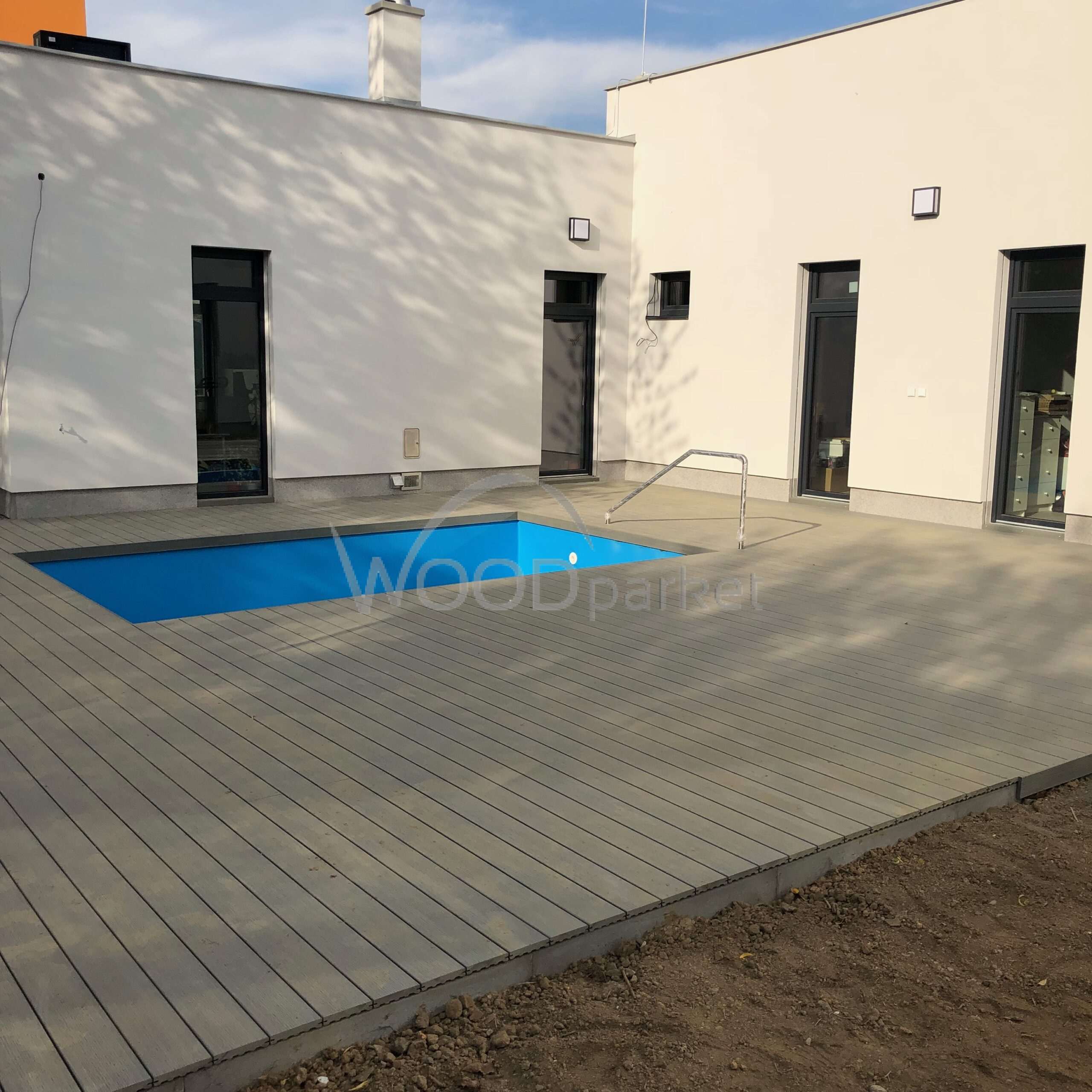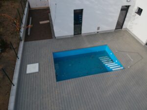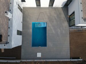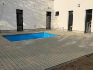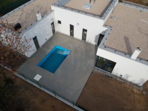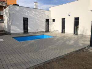 Použité materiály jsou odolné vůči povětrnostním vlivům, a díky tomu terasa kolem bazénu poskytuje komfortní a bezpečný povrch po celý rok. Napojení terasy přímo na dům navíc přináší praktický a estetický přechod mezi venkovní a vnitřní částí domu.