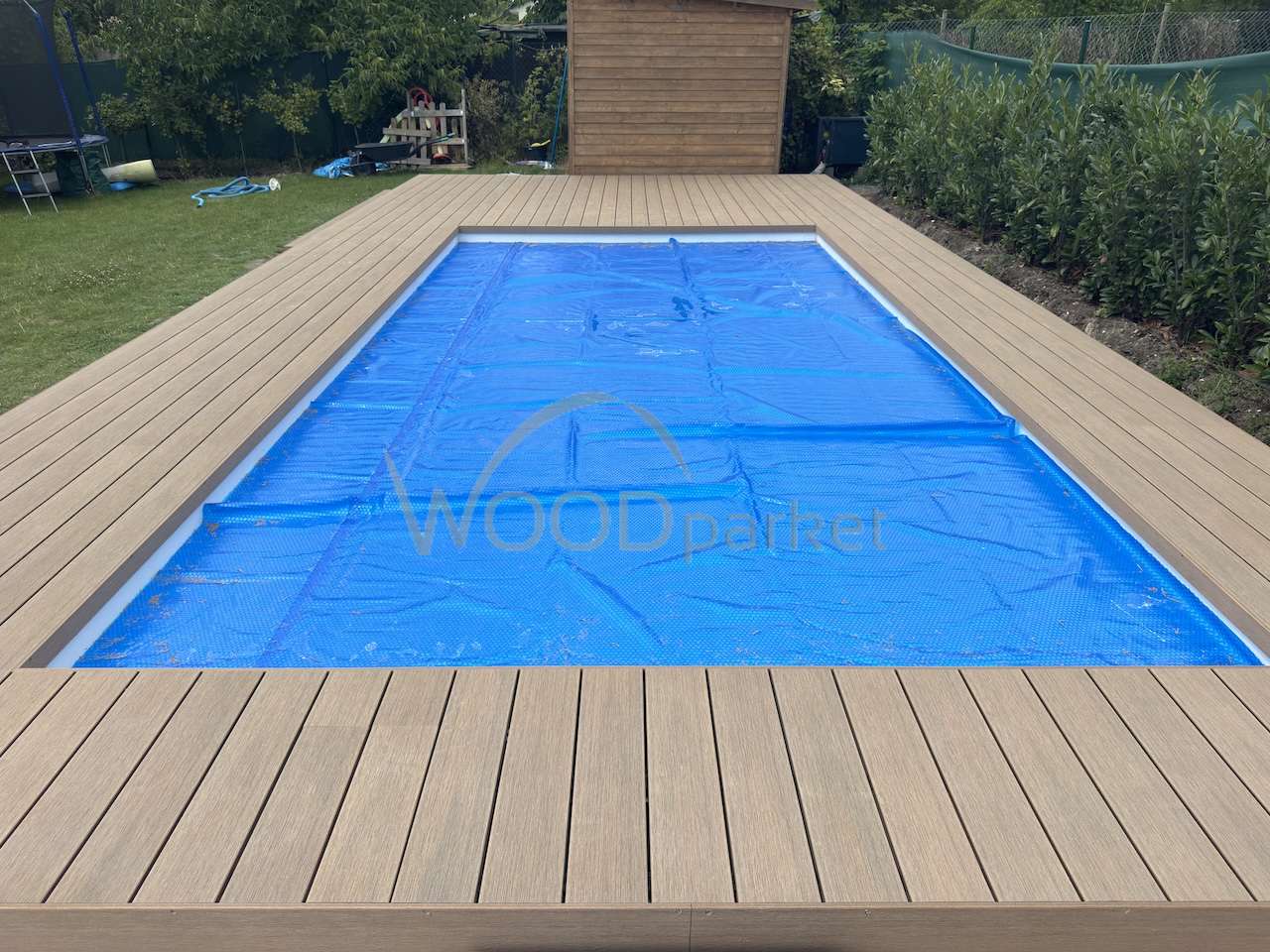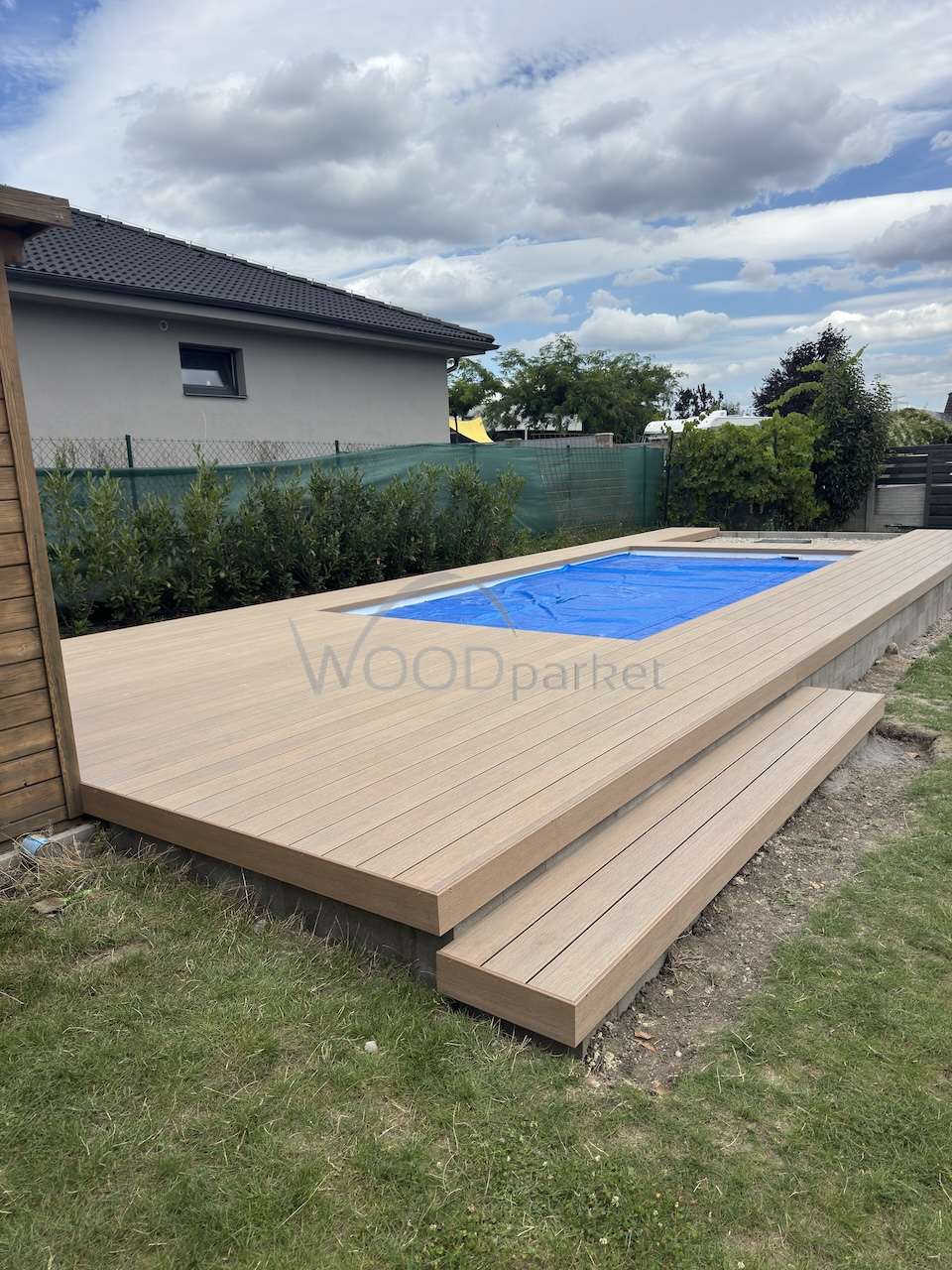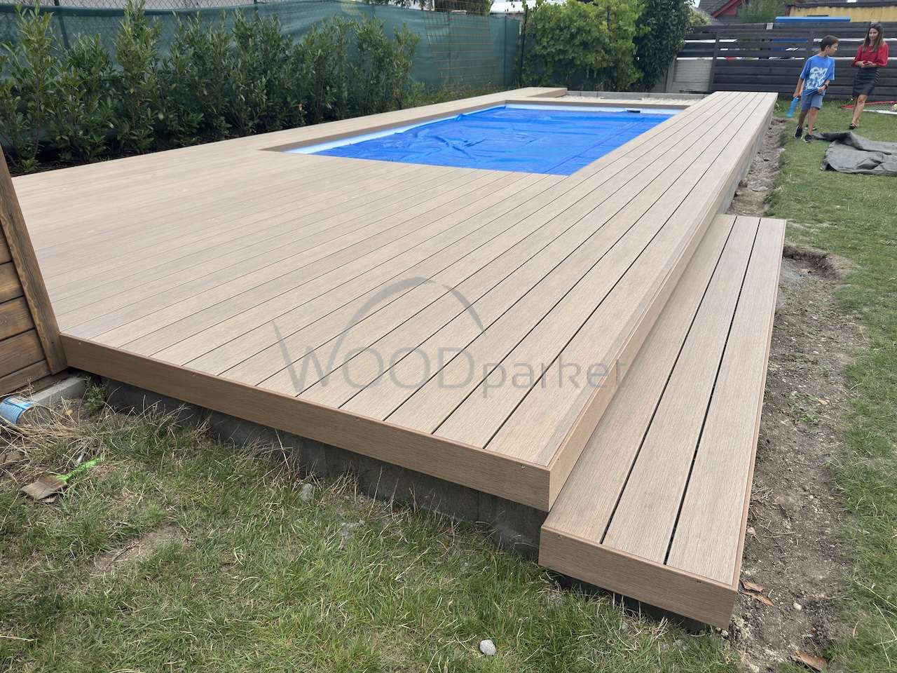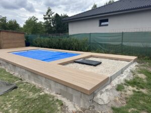 bazénová terasa Měšice, montáž WPC terasy Authentic Teak, realizace teras u bazénu,