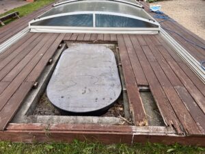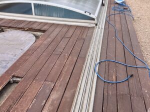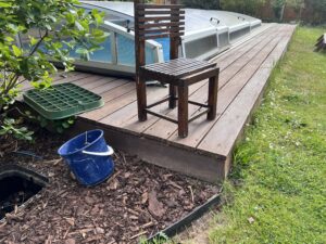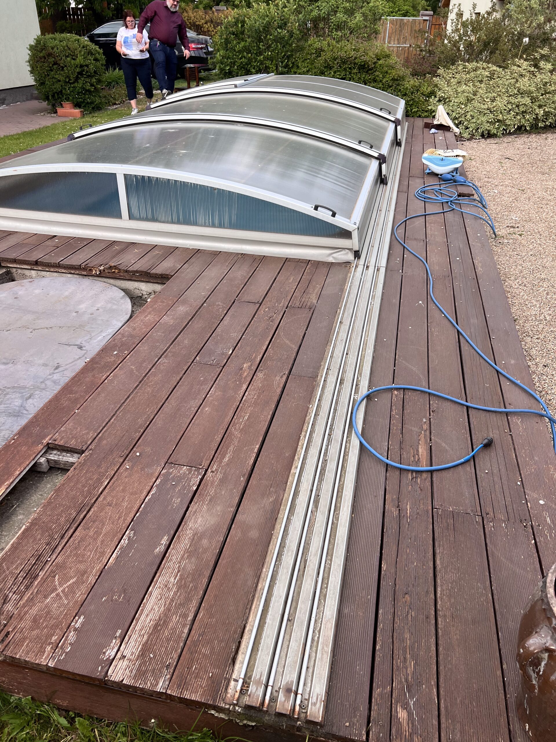 Staré dřevo u bazénu sice kdysi vypadalo dobře, ale čas a voda si vybraly svou daň. Povrch byl nerovný, místy kluzký a opticky už terasa působila unaveně.
