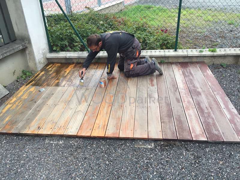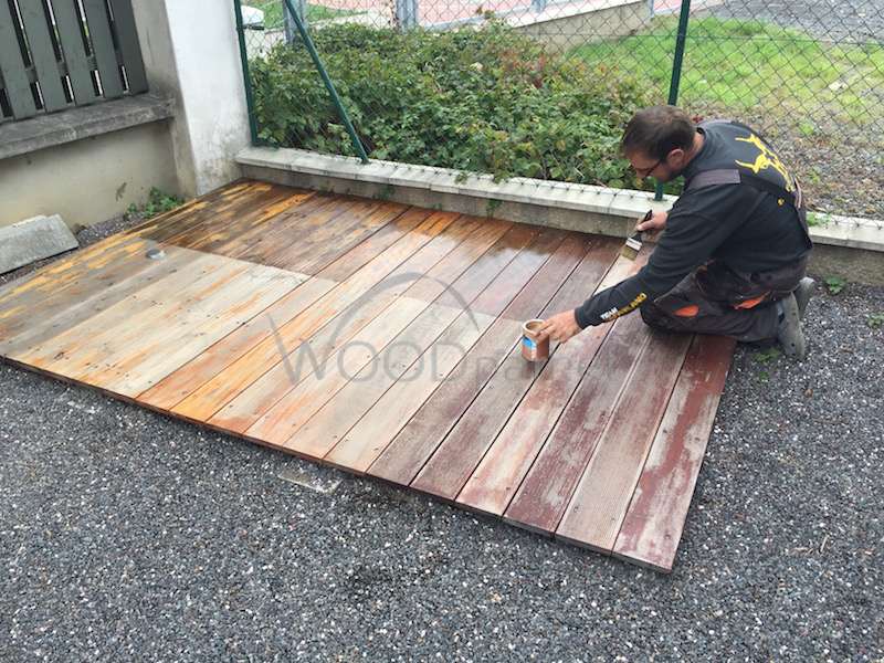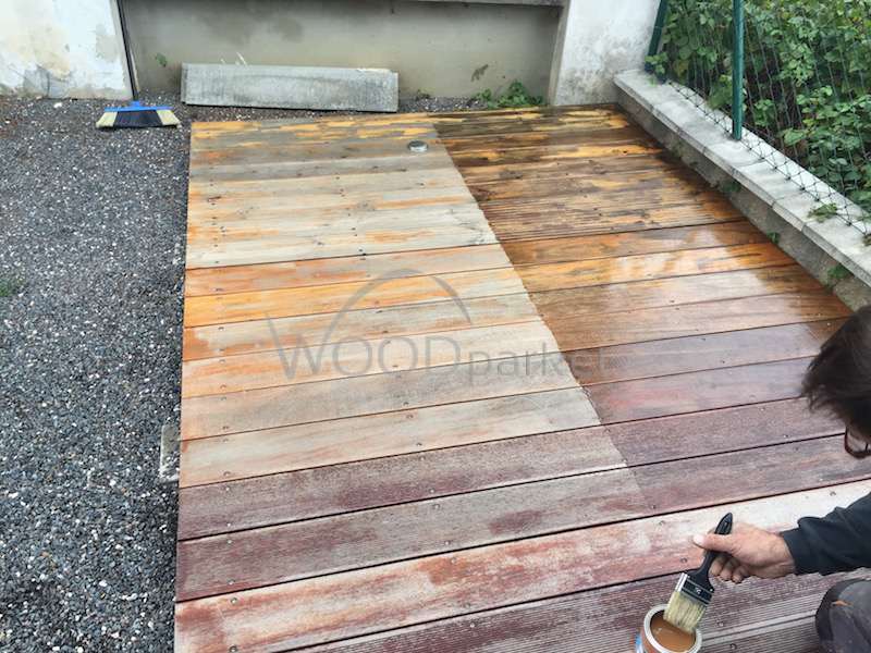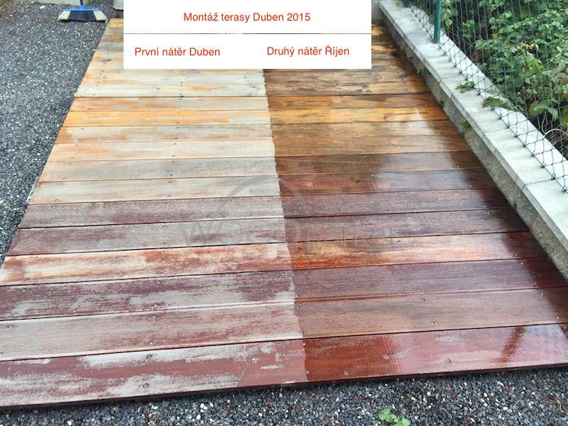 STerasu jsme opět natřeli, tak jako by ji měl zákazník udržovat doma. Polovina terasy zůstává nenatřena pro porovnání.